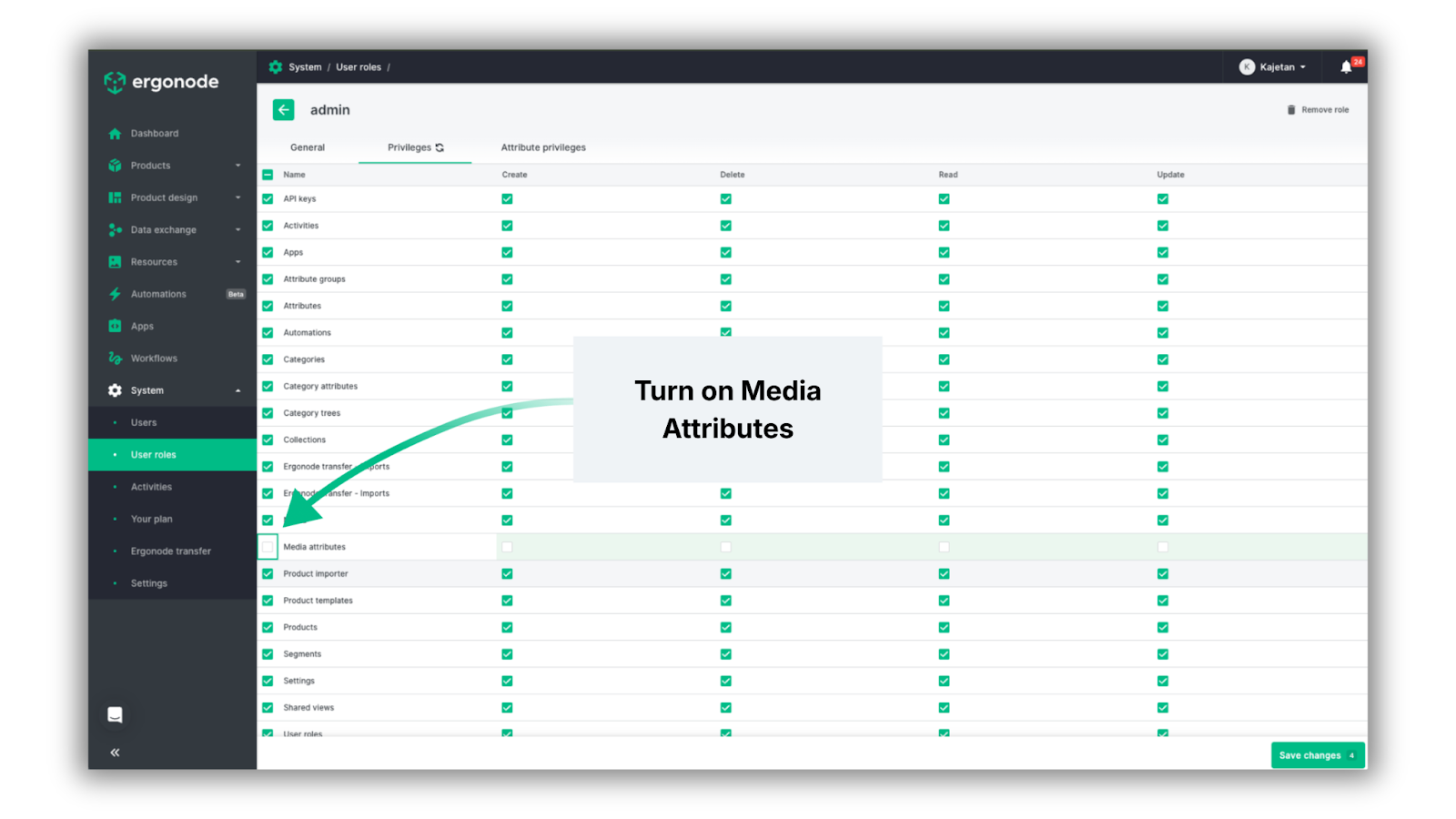 Before we go through the changes, make sure to turn on the DAM features. Head over to System → User roles, then choose the specific role and click on the pencil icon. To start using DAM features, please go to “Privileges” and tick the “Media attributes” box.