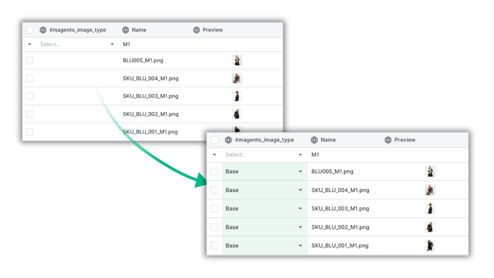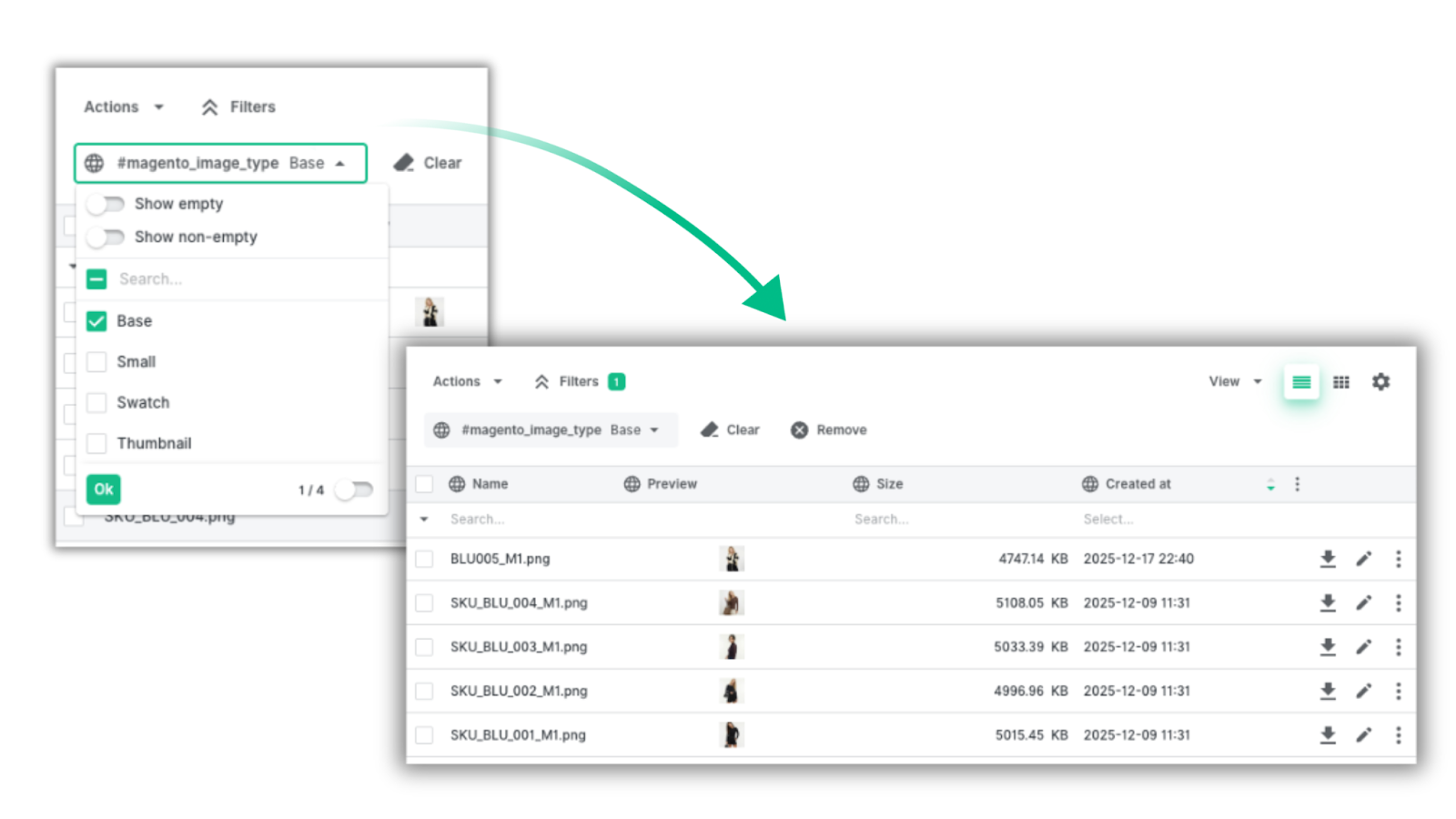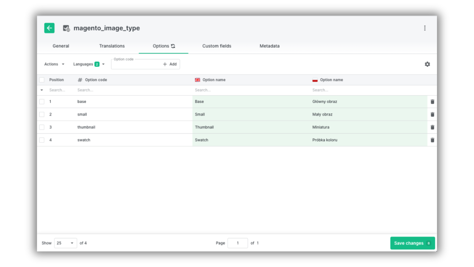 Let’s get back to our example. We added several options for the magento_image_type attribute: thumbnail, base, swatch and small. Now we can quickly assign these values to specific assets.