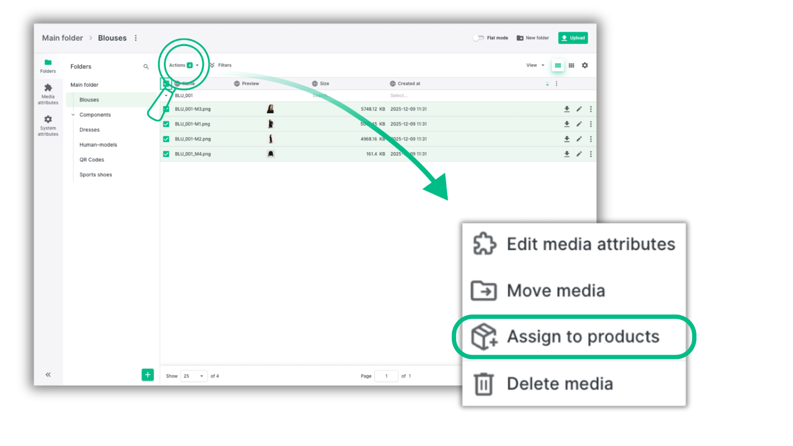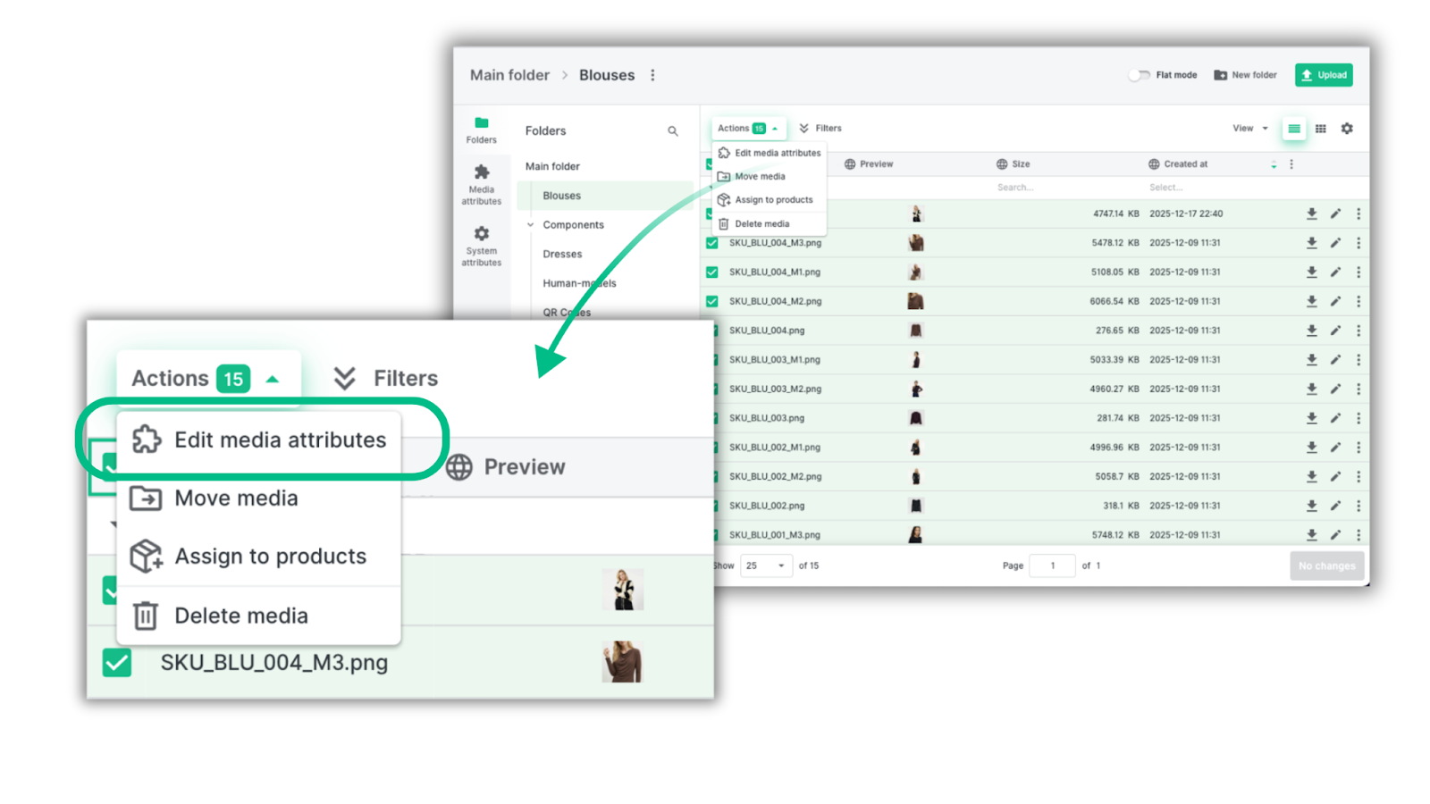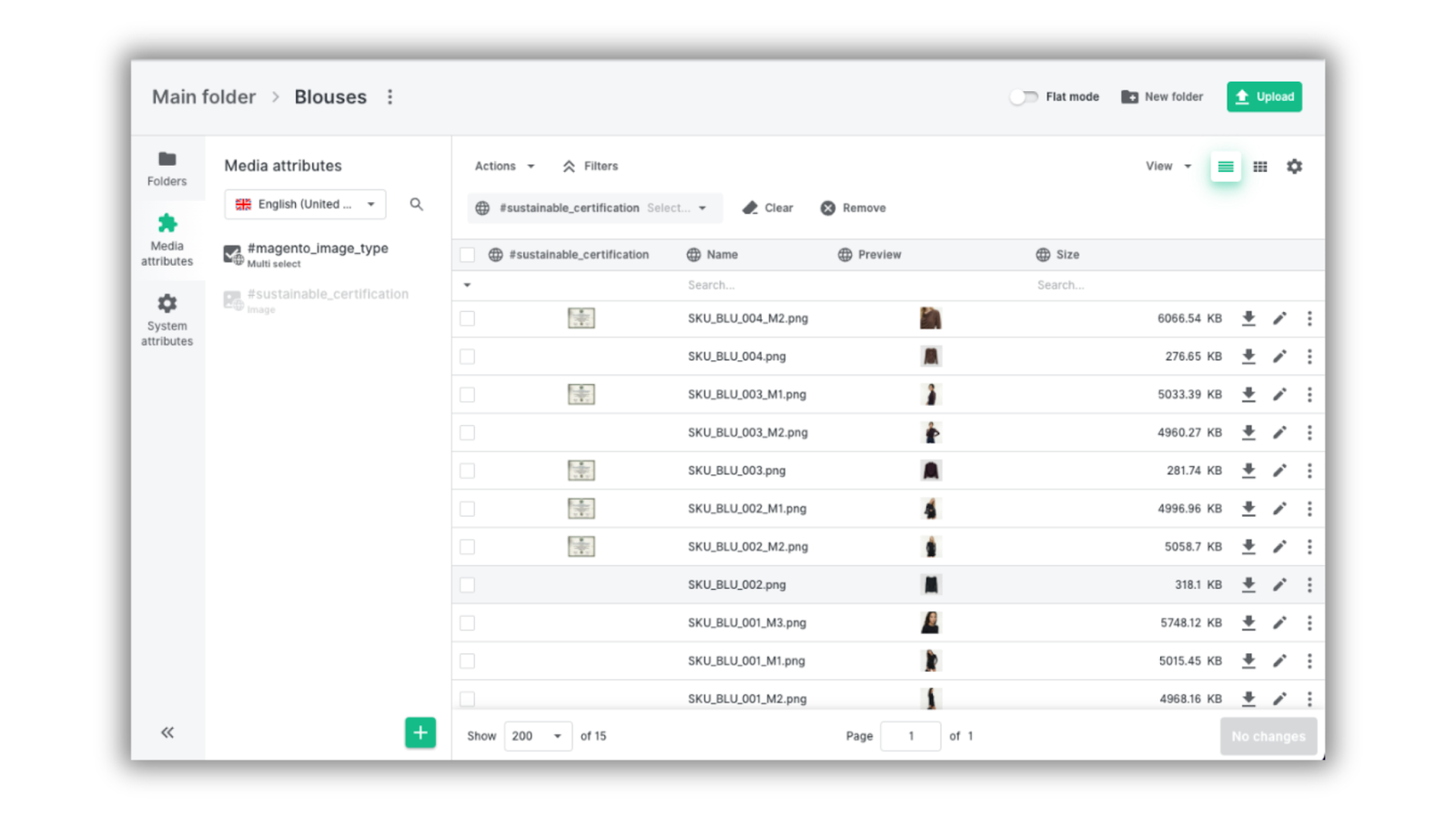 Under Media attributes, you’ll find all attributes that were enabled earlier — including the Magento attribute from our example. We added it as a column, and opened the Blouses folder to assign our Magento image type to all assets.