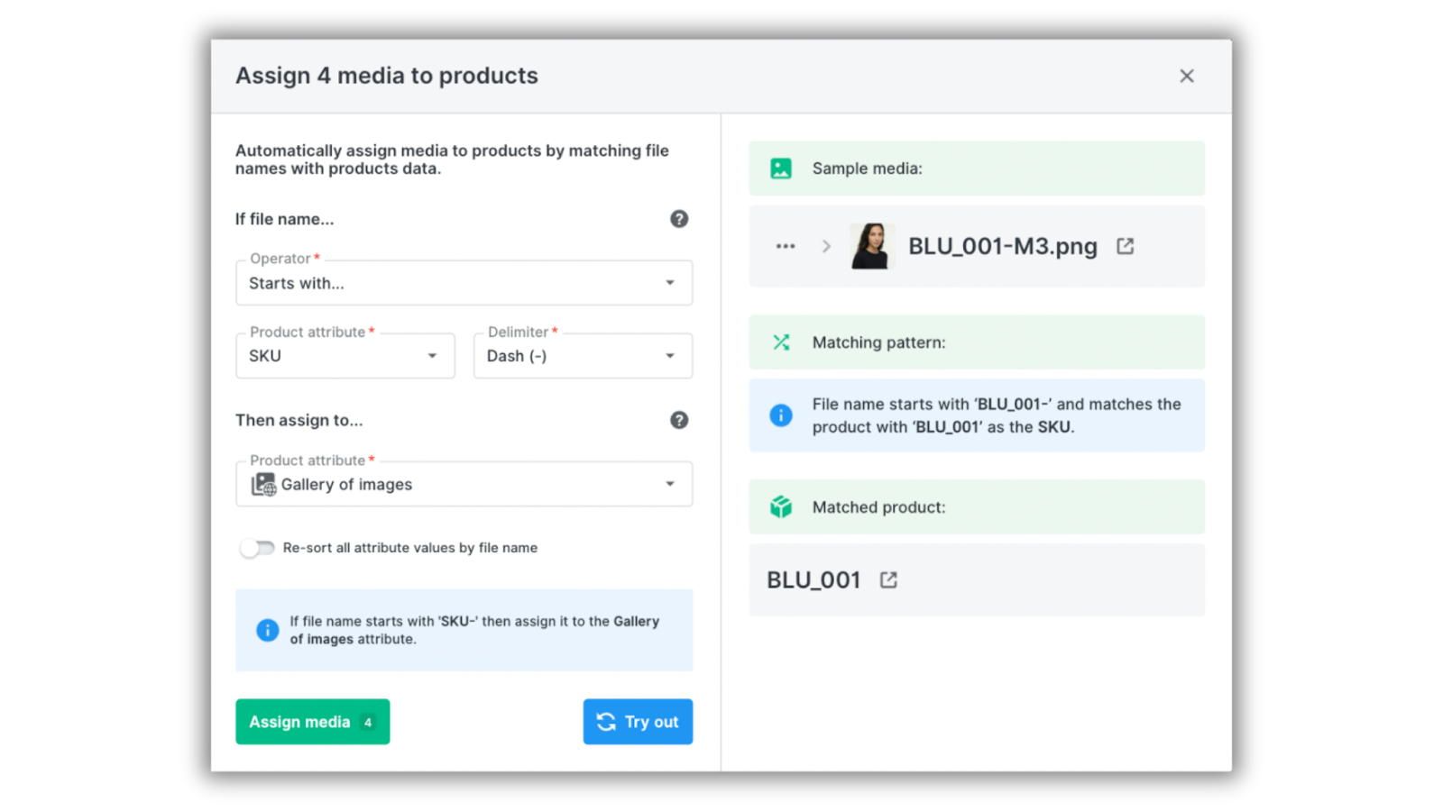 In our example, the system will look for a product with the SKU “BLU_001”. If there’s an exact match in the catalog, all selected images will be assigned to the Gallery of Images.