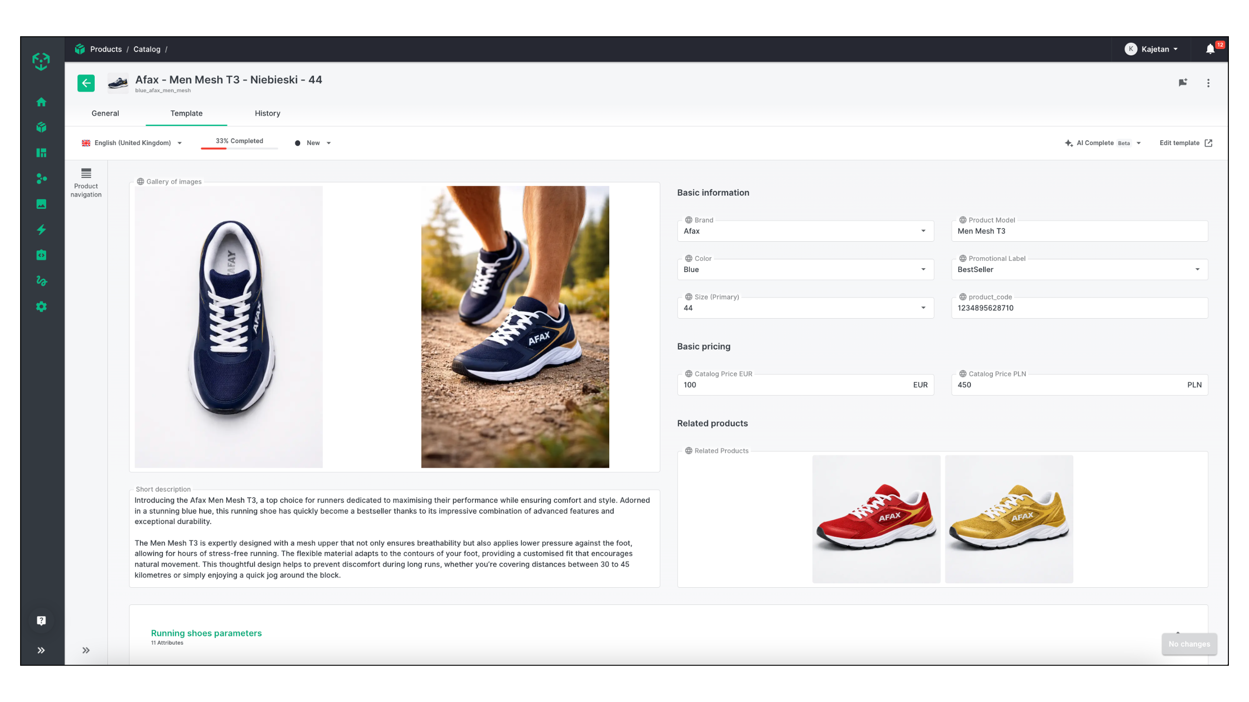 Below, we’ll show how such a product page is created in Ergonode PIM — from selecting a template to fully designing it in the Designer. We’ll use running shoes as a concrete example throughout the article.