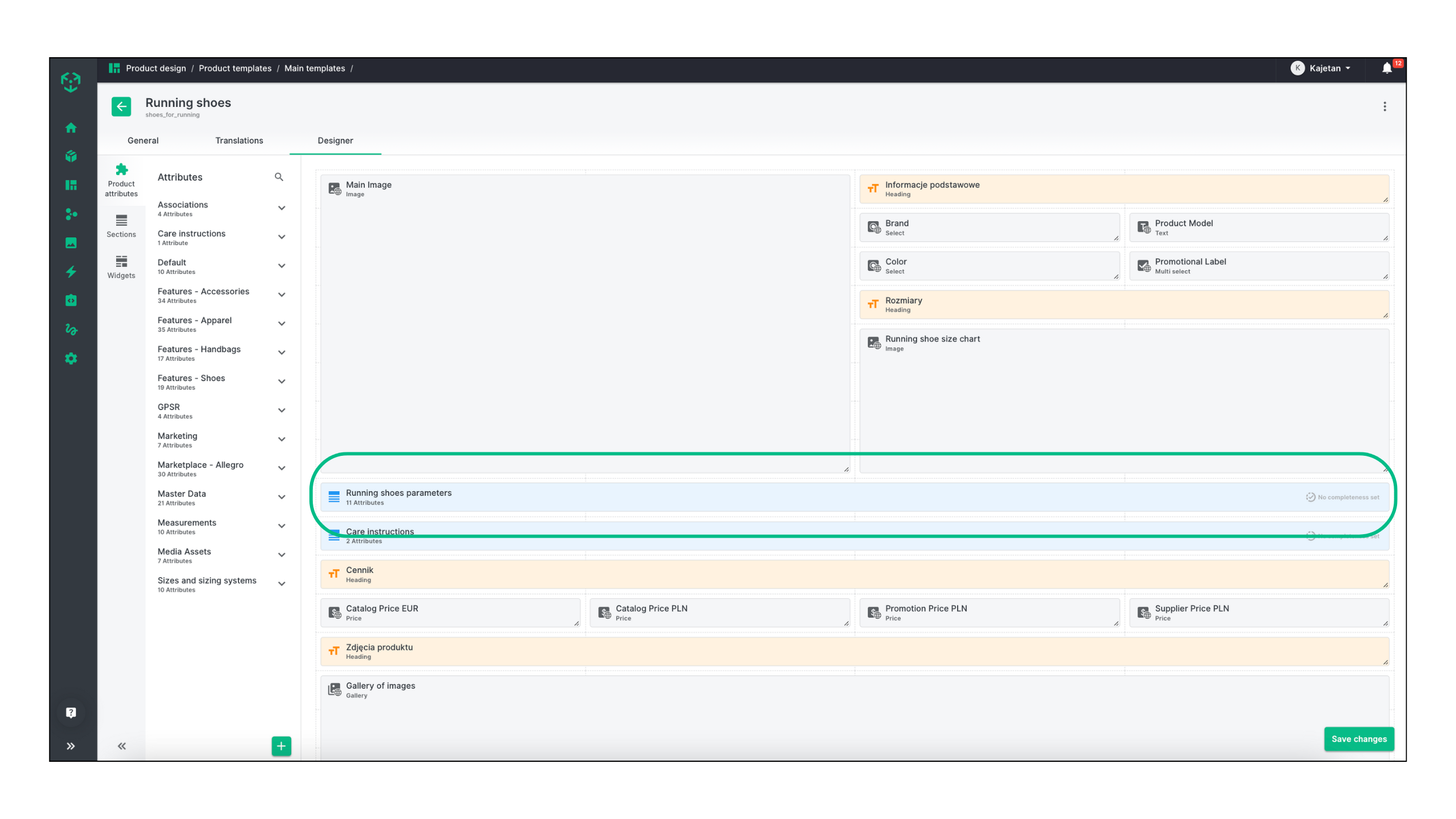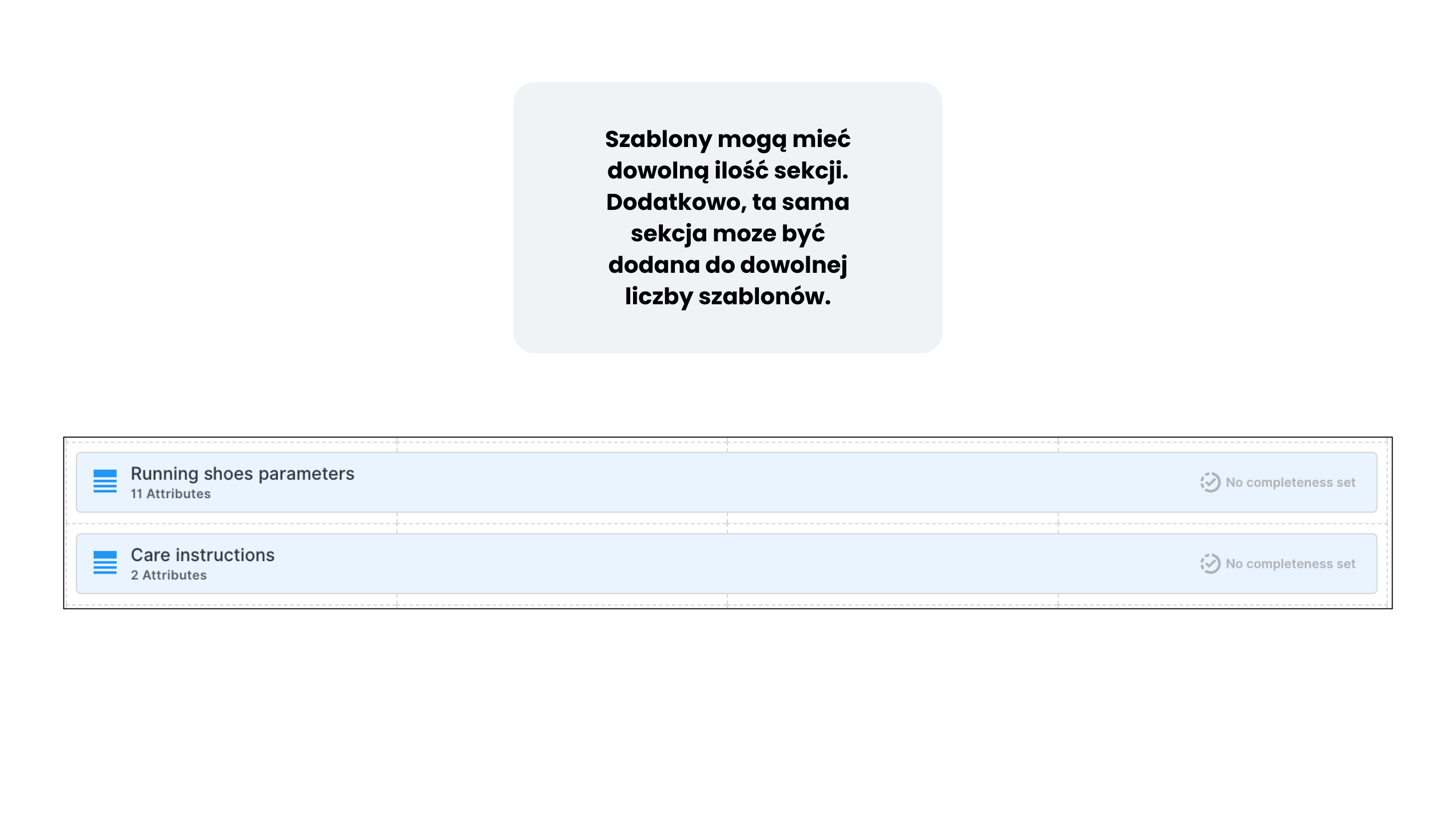 Ogromną zaletą sekcji jest możliwość dodawania tego samego zakresu informacji do wielu szablonów, np. w sytuacji, gdy zmieniają się przepisy i te same atrybuty muszą być dodane do wszystkich produktów w katalogu. Wtedy wystarczy edytować sekcję, a zmiany pojawią się w każdym szablonie, który z niej korzysta. To także spora oszczędność czasu, gdy potrzebne jest edytowanie wybranych informacji dla setek produktów.
