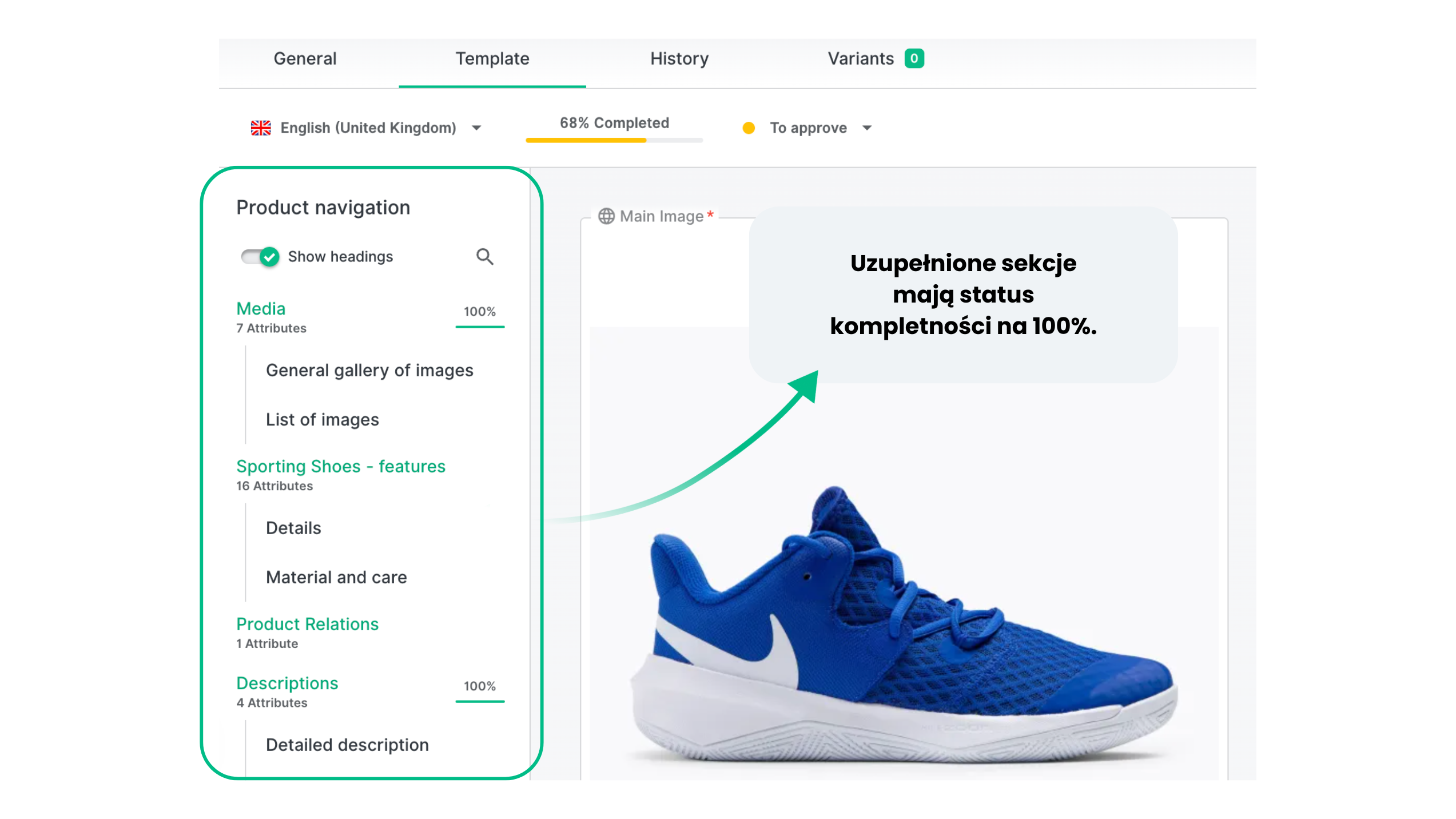 Zbiory atrybutów mogą mieć określone poziomy kompletności, dzięki czemu łatwiejsze staje się monitorowanie na jakim etapie gotowości do publikacji jest dany produkt.