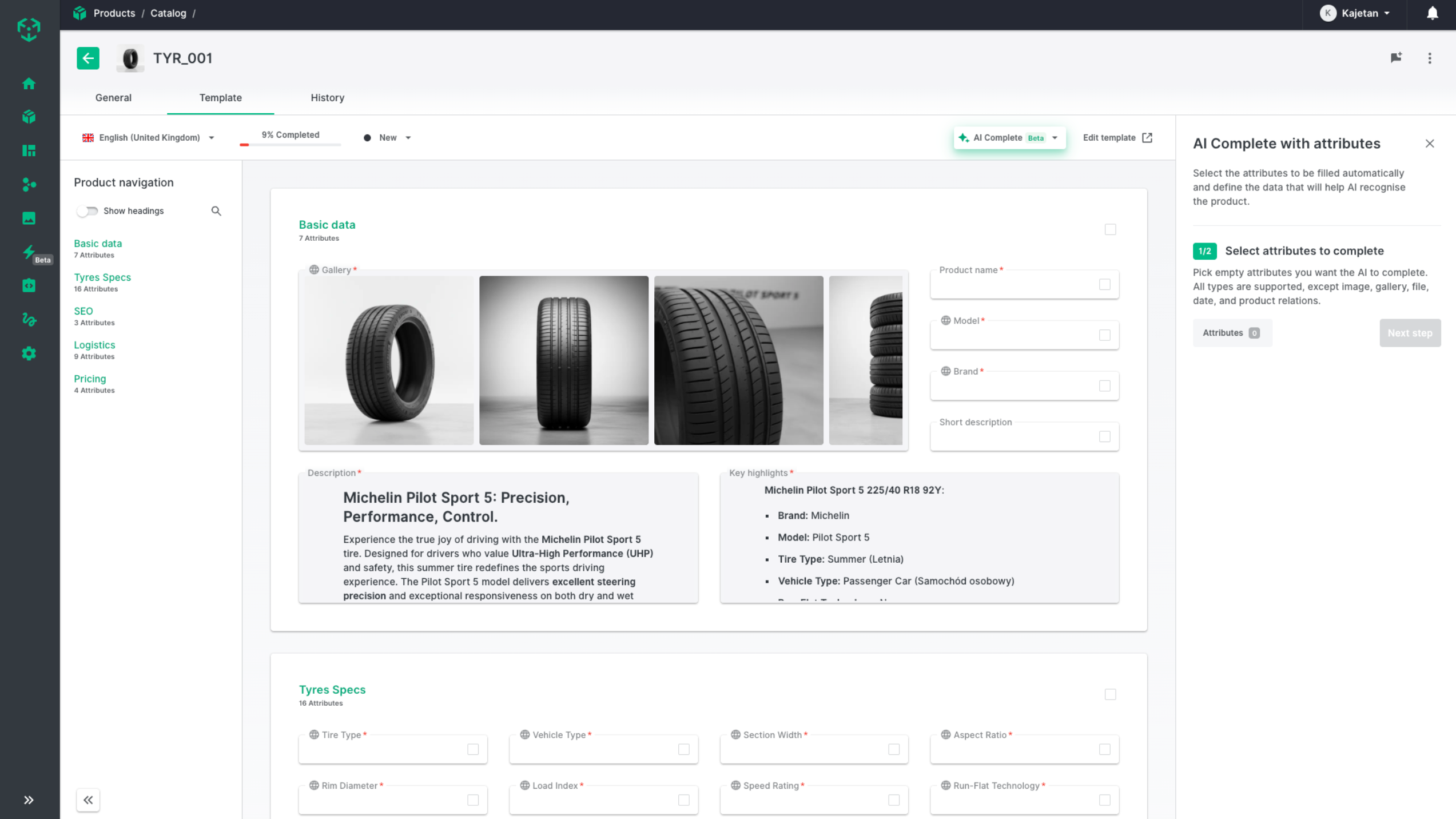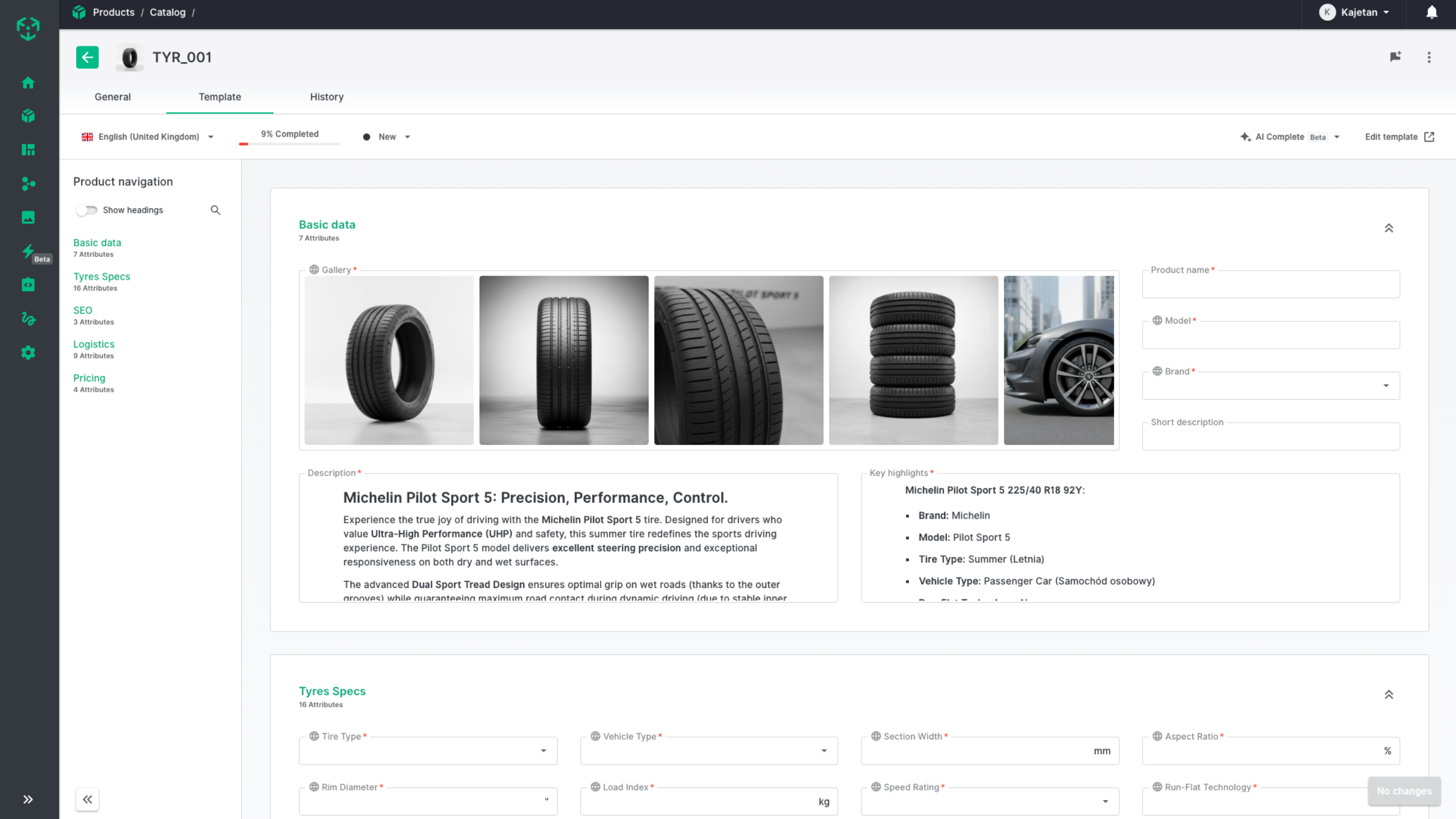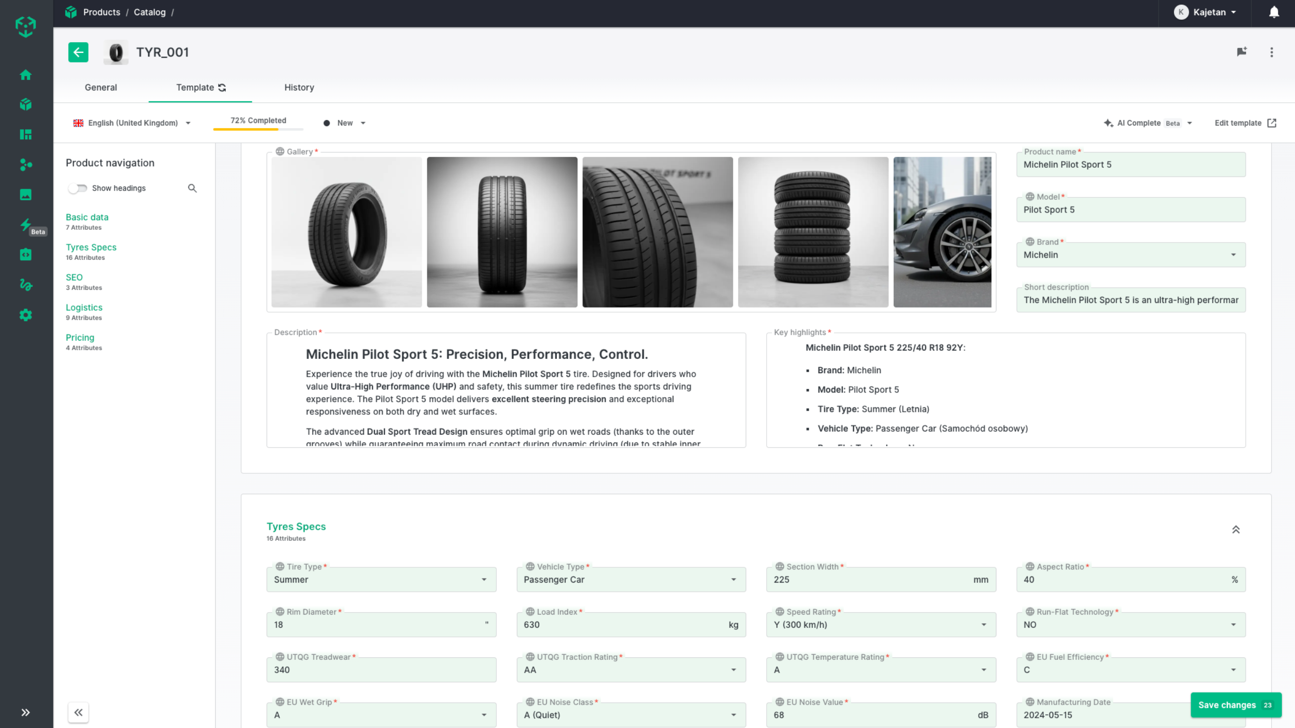 Przejdźmy przez przykład strony produktu opony. Naszym celem będzie uzupełnienie zestawu atrybutów na podstawie danych już zapisanych w systemie.
