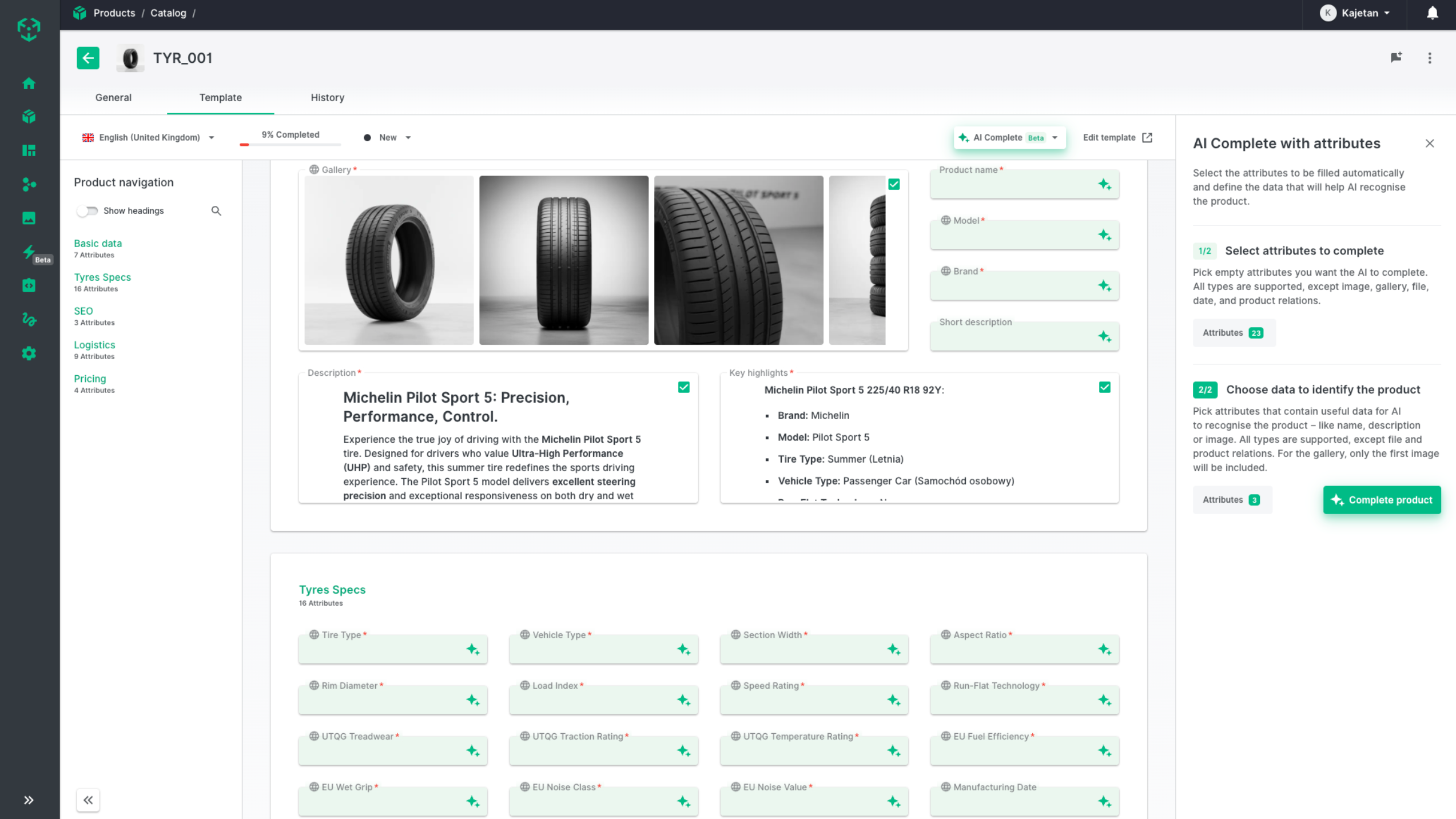 Dzięki funkcji Uzupełnij z AI, nowości w Ergonode PIM, możesz wykorzystać dowolny opis produktu lub listę kluczowych cech i automatycznie wygenerować kompletne atrybuty na ich podstawie.
